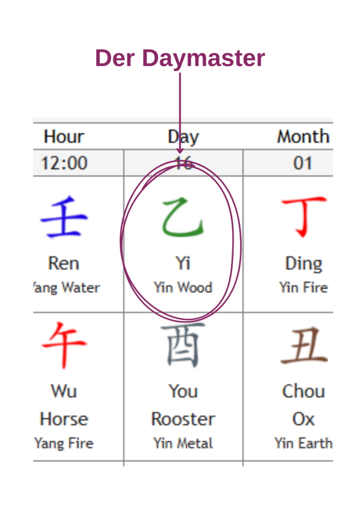 Das Herzstück und auch der Ausgangspunkt einer BaZi-Analyse ist der Daymaster auch Selbstelement oder Tageselement genannt. Er befindet sich in der Tagessäule, genauer gesagt im Himmelsstamm des Tages. Ich habe in dir hier eingekreist. In diesem Beispiel ist es das grüne Zeichen Yi = Yin Wood = Yin Holz.