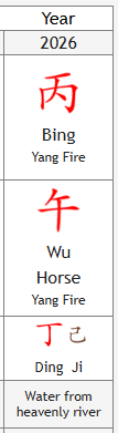 Was 2026 fehlt, ist 💦 Wasser 💦, also Ruhe, Reflexion und Abkühlung. Außer dieses Element ist im eigenen BaZi-Chart bereits stark vorhanden. Wasser bedeutet für jeden Menschen – je nach Daymaster – etwas anderes. Mehr dazu demnächst. Trage dich gerne in meinen Newsletter ein, um mehr zu erfahren.
